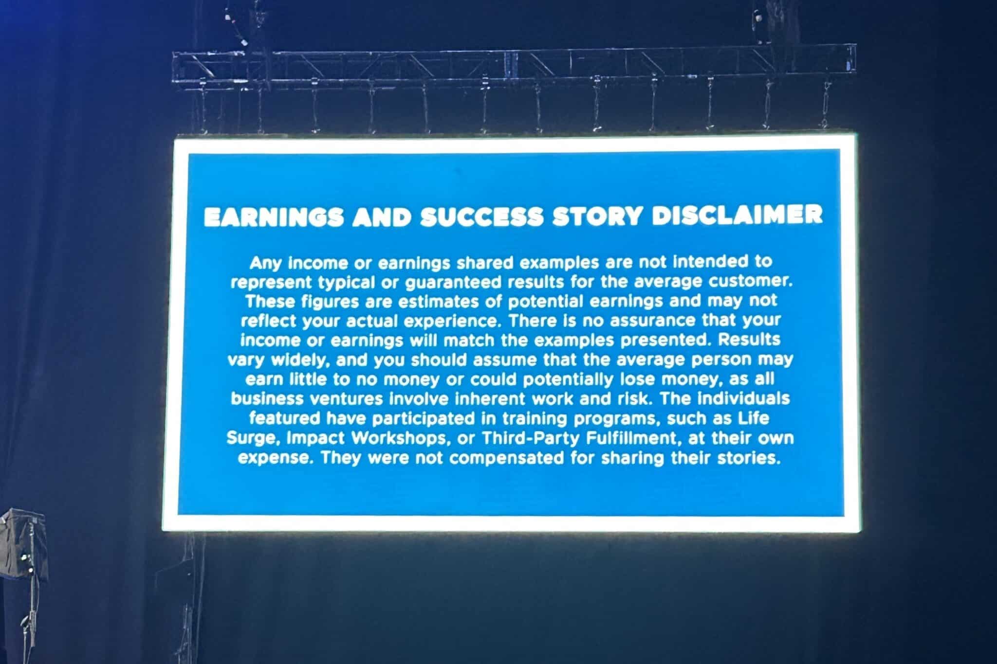 At Life Surge events, disclaimers briefly appear on screens in the venue alerting attendees that “you should assume that the average person may earn little to no money or could potentially lose money” and that “results vary wildly.”